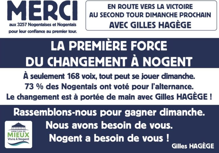 À l’issue du premier tour des élections municipales à Nogent-sur-Marne, la liste conduite par Gilles Hagège tient tout d’abord à adresser un message de remerciement sincère à toutes les Nogentaises et à tous les Nogentais qui lui ont accordé leur confiance.