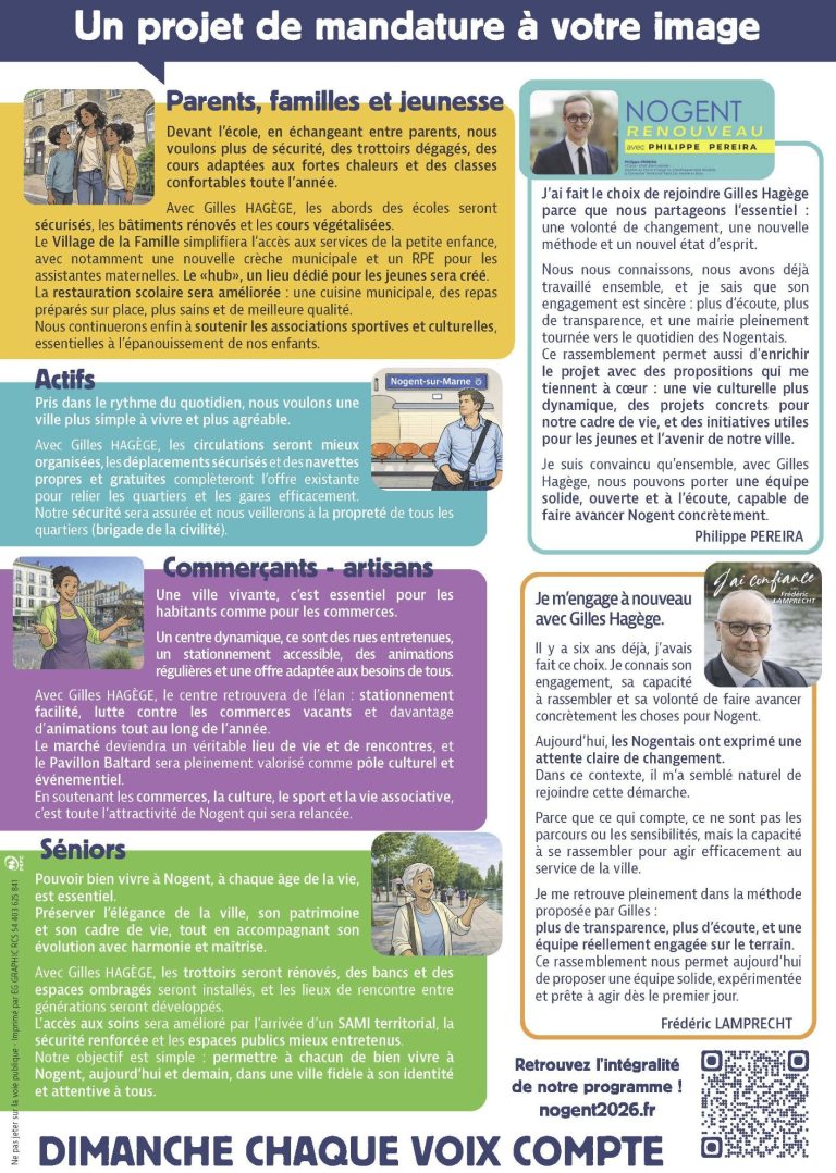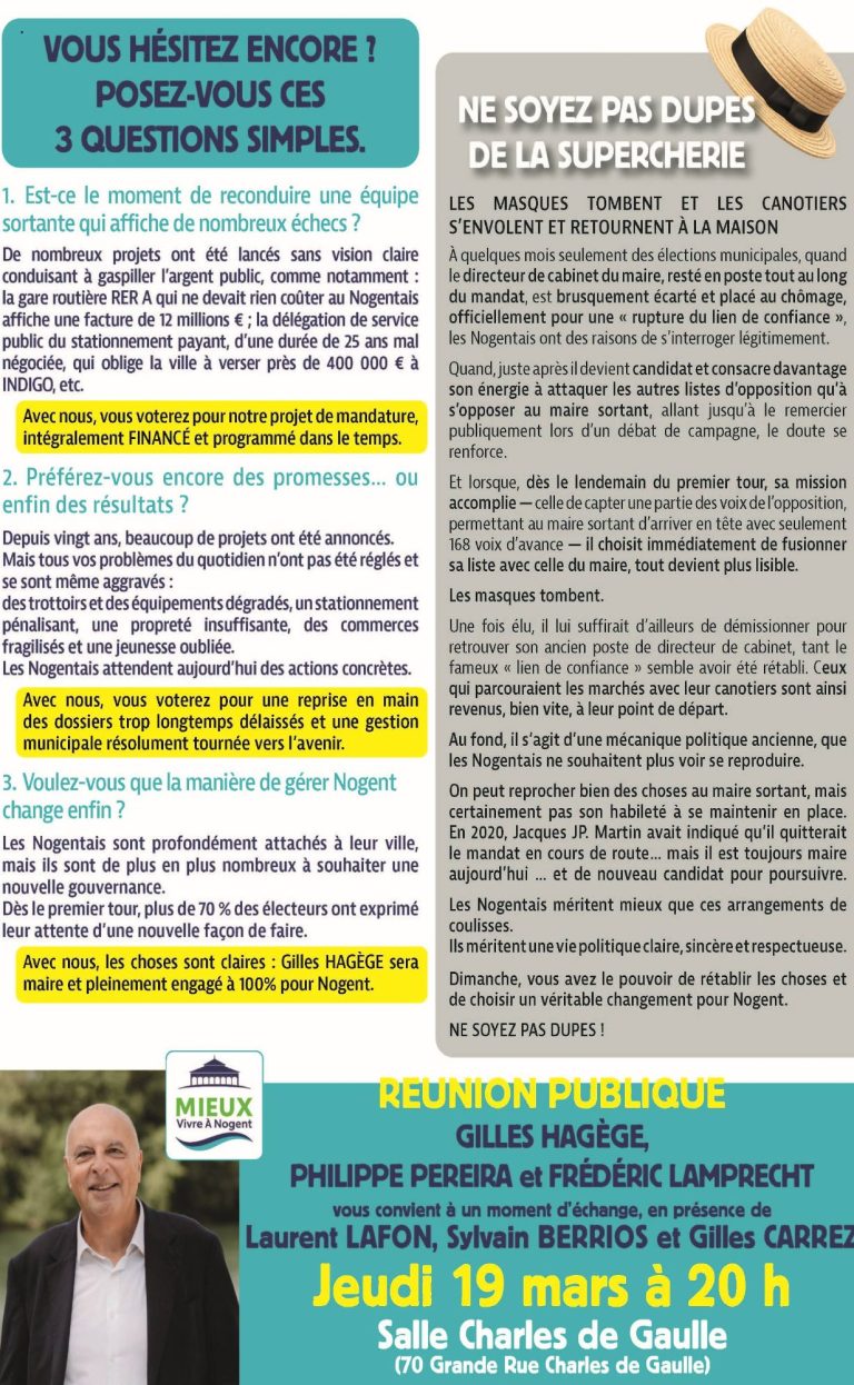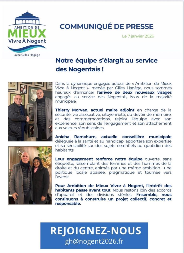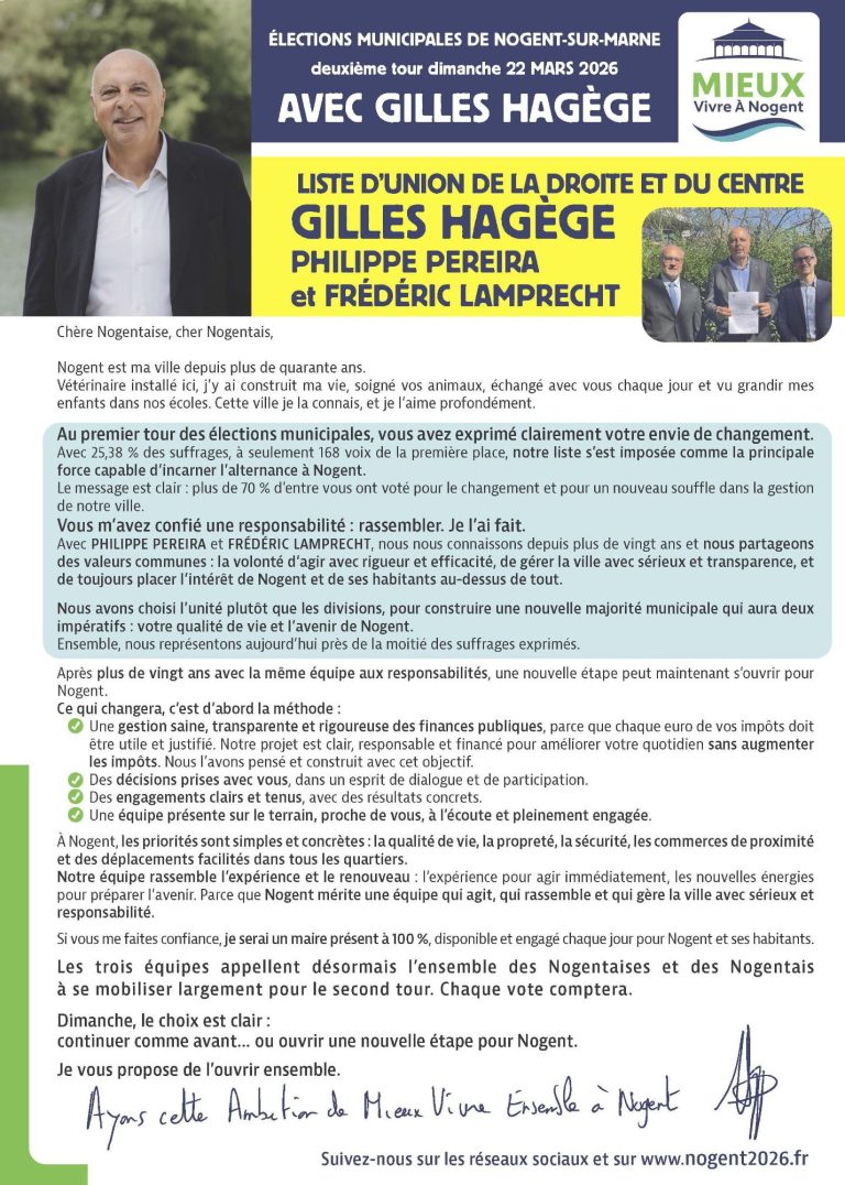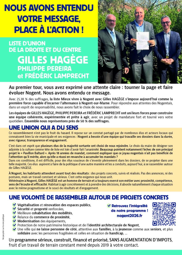 « Dans l’entre-deux-tours, nous faisons le choix du rassemblement et de la responsabilité. Ce qui nous unit est plus fort que ce qui pourrait nous diviser : l’envie d’agir concrètement pour Nogent et pour ses habitants », déclarent Gilles Hagège, Frédéric Lamprecht et Philippe Pereira.