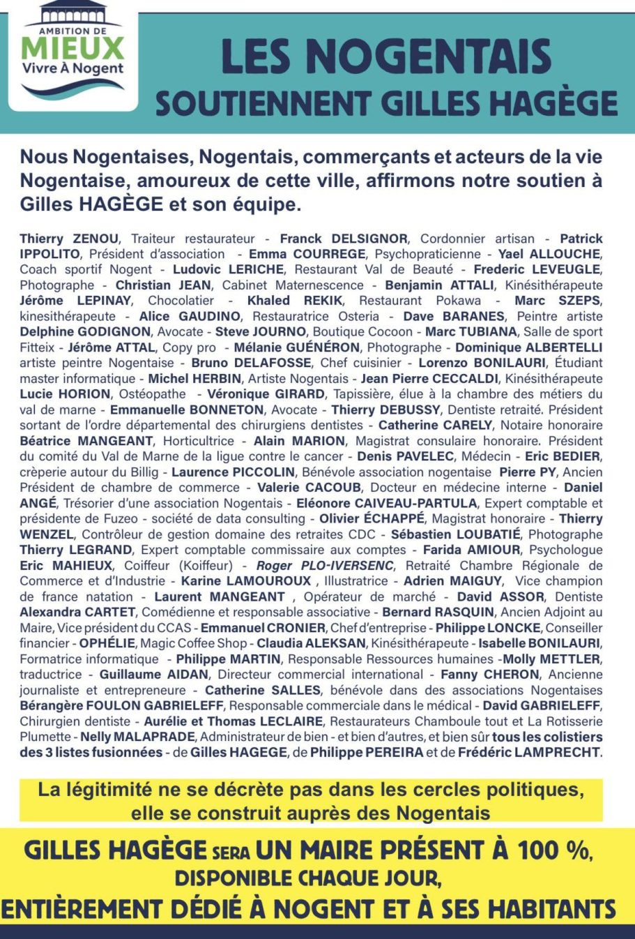 Nogentais avant tout, Gilles Hagège est un élu impliqué, présent au quotidien, qui connaît bien les enjeux municipaux : il a les qualités pour être un bon Maire de Nogent.